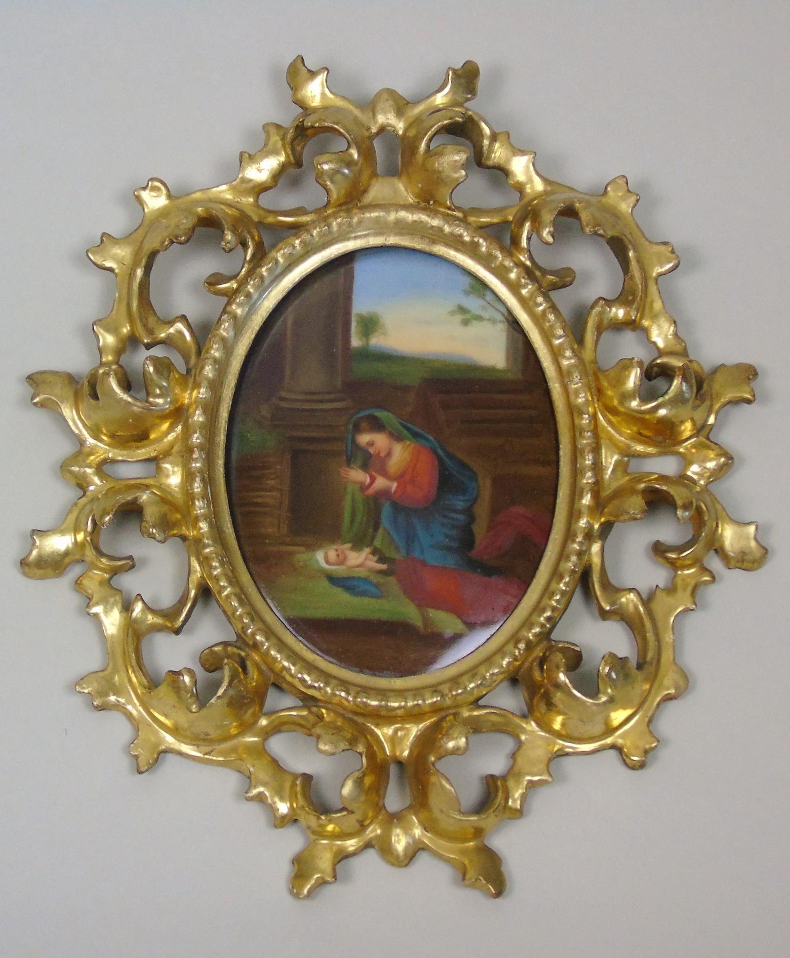 Italian Porcelain Plaque in Giltwood Hand Carved Frame Madonna & Child