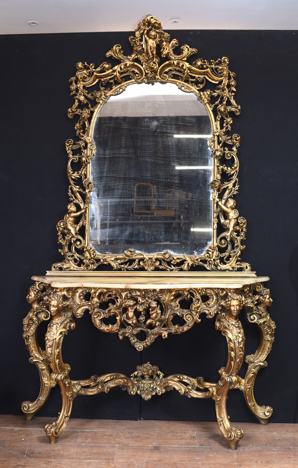 Italian Rococo Mirror & Console Table Set Onyx Marble c.1920