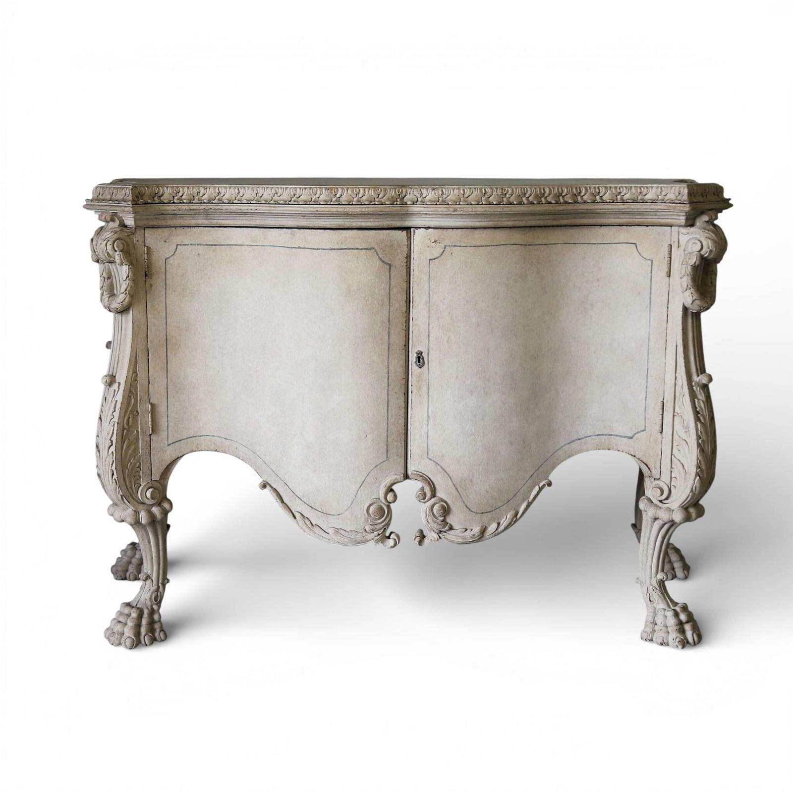 A beautifully decorative Italian serpentine‑shaped cabinet dating from around 1920, raised on wonderfully sculptural mythical‑beast feet. The piece is richly carved, with detailed work around the top moulding and elegant motifs across the doors. Later painted in a soft distressed white, it has a gentle, time‑worn look that enhances its curves and carvings, while the hand‑painted distressed marble top adds depth and sophistication.