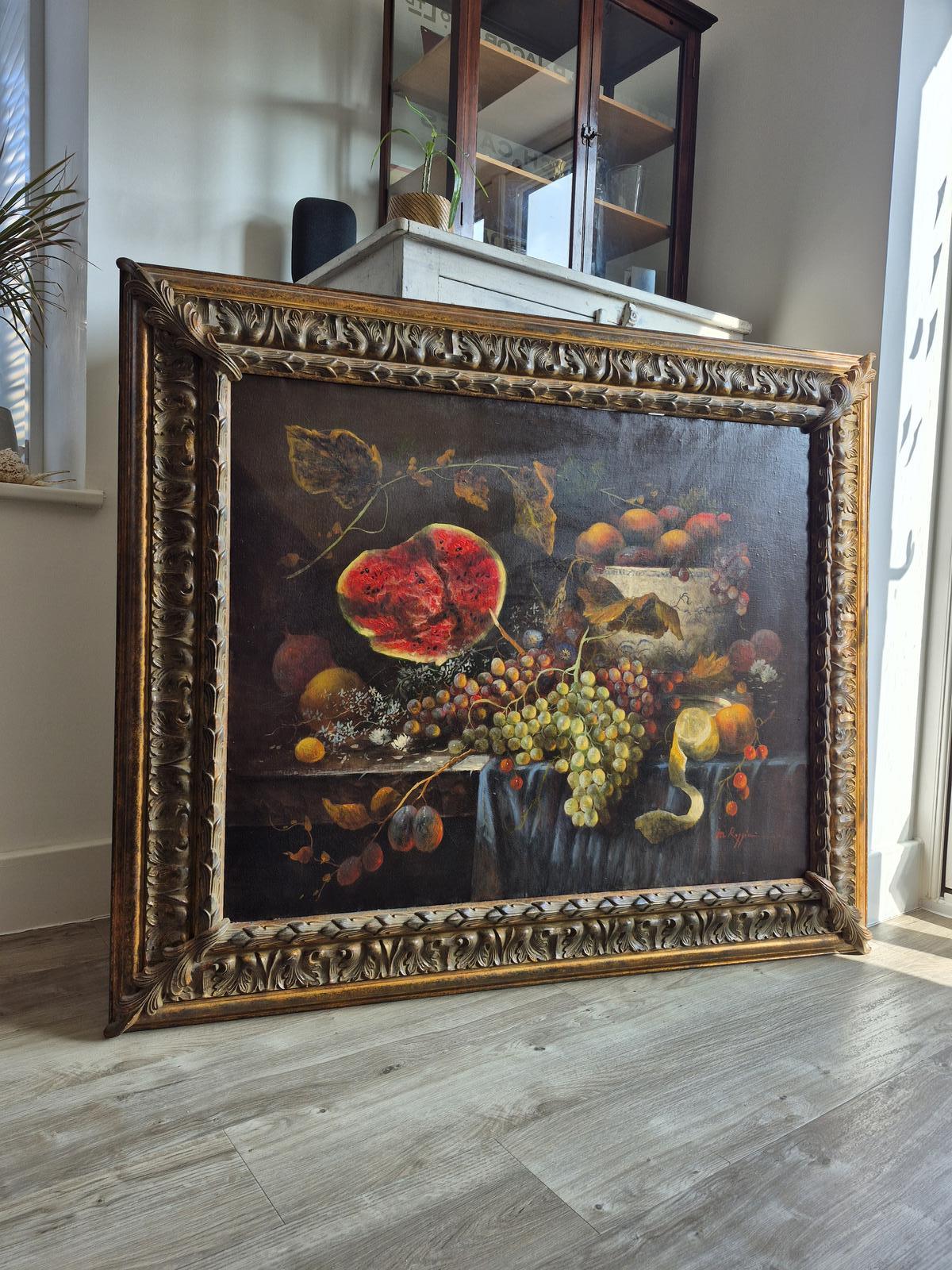 Beautiful large vintage oil painting by Massimo Reggiani, this is a stunning piece of art that will add character to any room. The painting features a still life composition of fruit and flowers, with intricate details that showcase the artist's skilful production technique. The canvas is framed and signed by the artist, making it a unique and valuable addition to any collection.