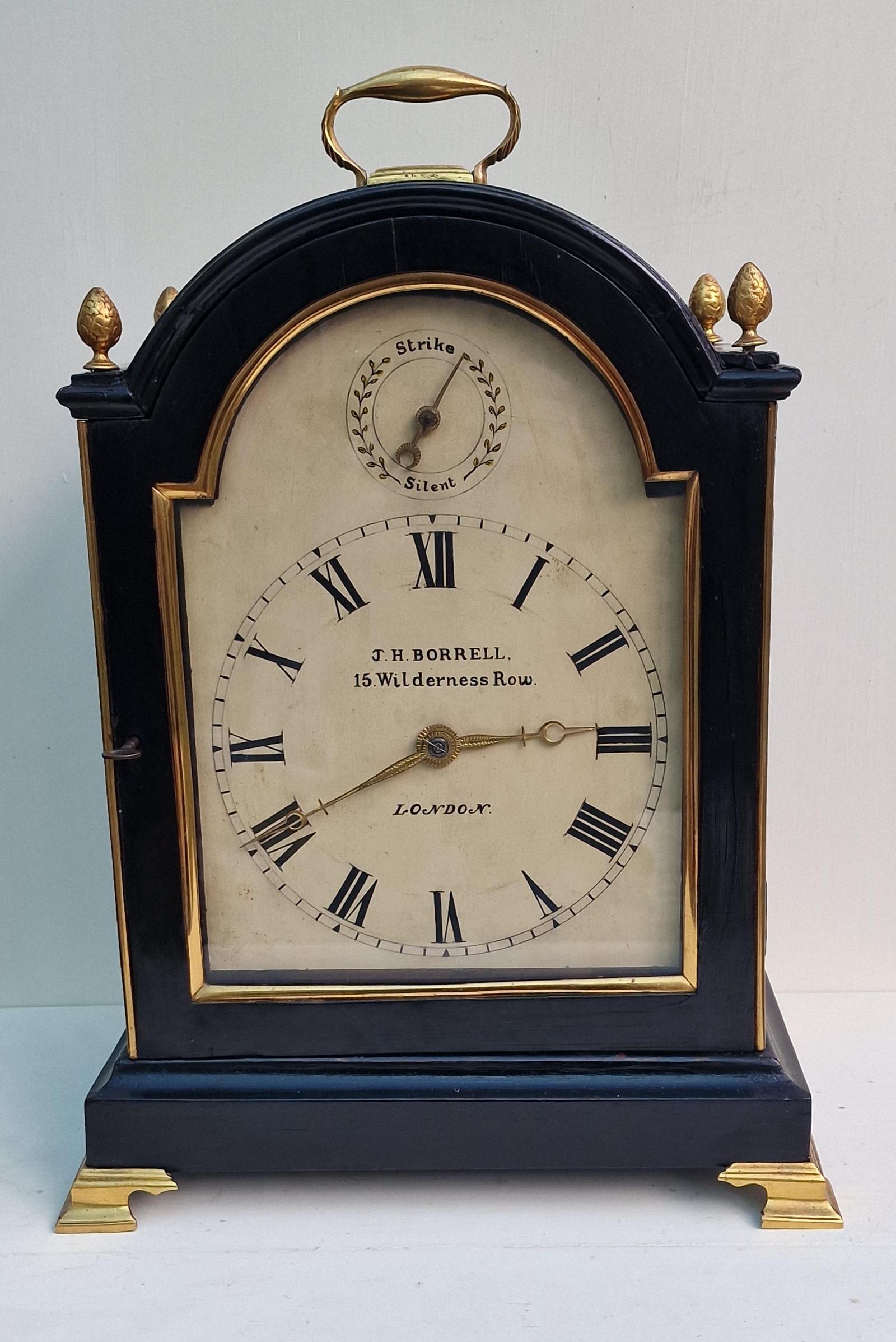 A London, ebonised bracket/table clock of good proportions. The case front has gilded brass edging to the dial and standing on gilded ogee feet. Brass fretwork to the case sides with silk backing. Gilded brass edging to the case sides. An arched painted dial signed 'J H Borrell 15 Wilderness Row, London' with a strike/silent to the arch. Lovely engraved hands. A fine quality, twin fusee mechanism striking the 1/2 hours and hours on a bell. A beautifully engraved backplate to the mechanism signed 'J H Borrell, London' within a cartouche. A glass back door showing the mechanism. Circa 1835.