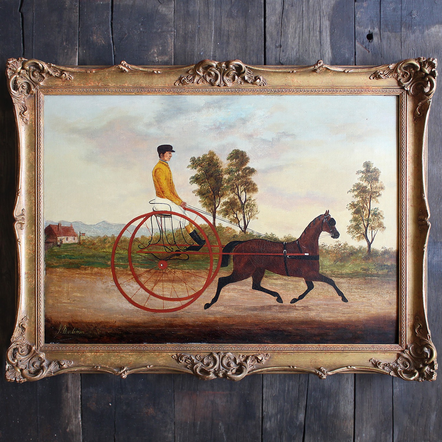 J Mortimer, Pony & Trap with Rider, Naive, Provincial Antique Oil Painting, Horse