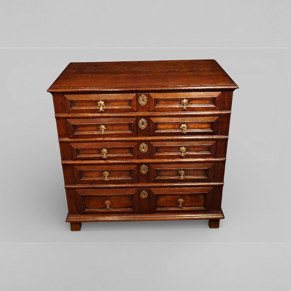 This fine Jacobean oak chest of drawers dates from the late 17th century and displays the robust construction and restrained decorative character typical of the period. Crafted from solid oak with a rich, warm patina developed over centuries, the chest offers both historical presence and practical storage.