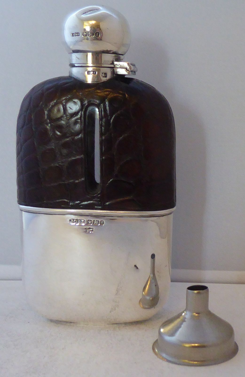 James Dixon 1892 Solid Hallmarked Silver Hip Flask Glass Bound Crocodile Skin