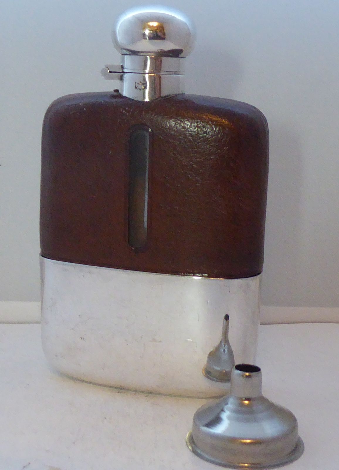 James Dixon 1930s Silver Plated Leather Bound Glass Hip Flask