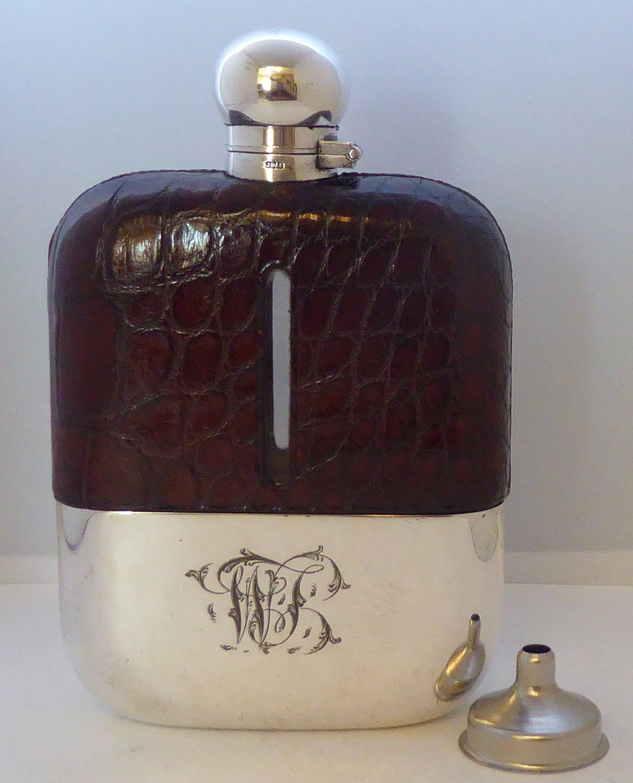 James Dixon c.1910 Silver Plate Plated Crocodile Skin Bound Glass Hip Flask 12 1/2 Fl Oz