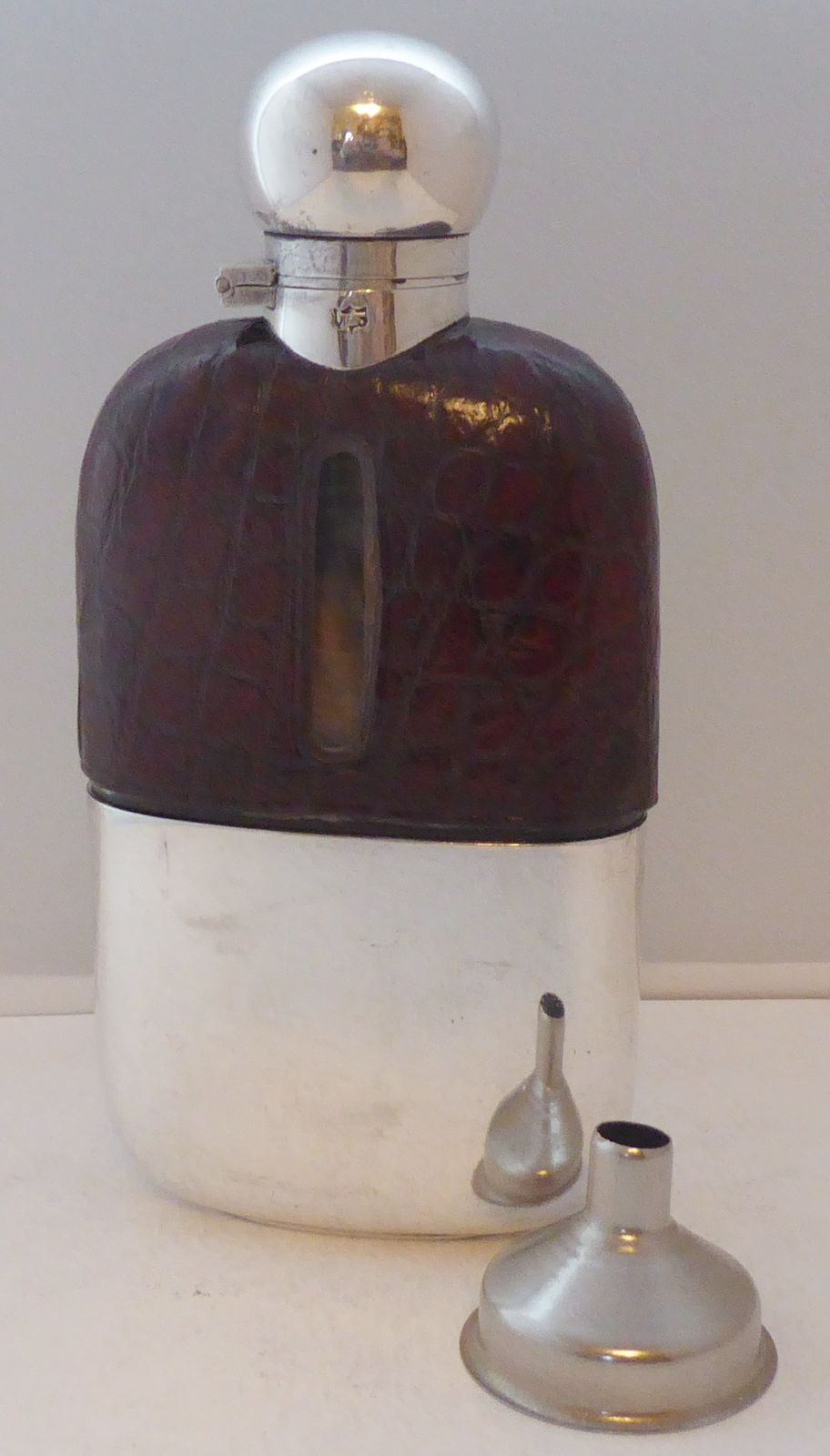 James Dixon Silver Plated Crocodile Skin Bound Glass Hip Flask 1930s