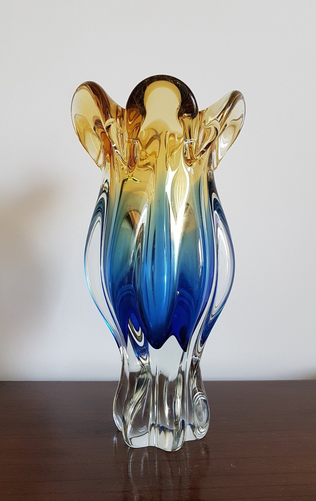 Japanese Bohemian Cobalt Blue & Citrine Yellow Biomorphic Art Glass, Tulip Cased Glass Vase