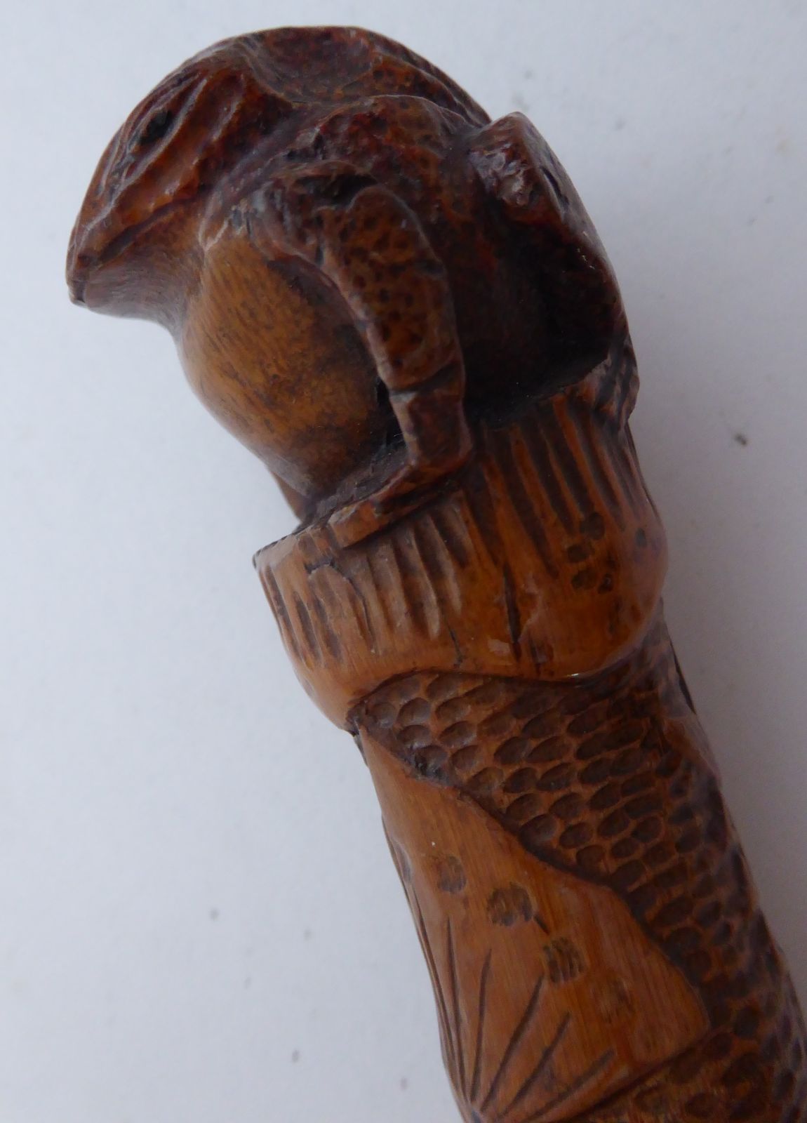 Japanese Carved Bamboo Shaft Walking Stick Cane Toad Top Insects c.1920