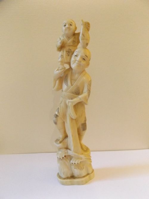 Japanese Ivory Okimono of a Fisherman Holding a Boy On His Shoulders C1890 Meiji Period 21Cm High