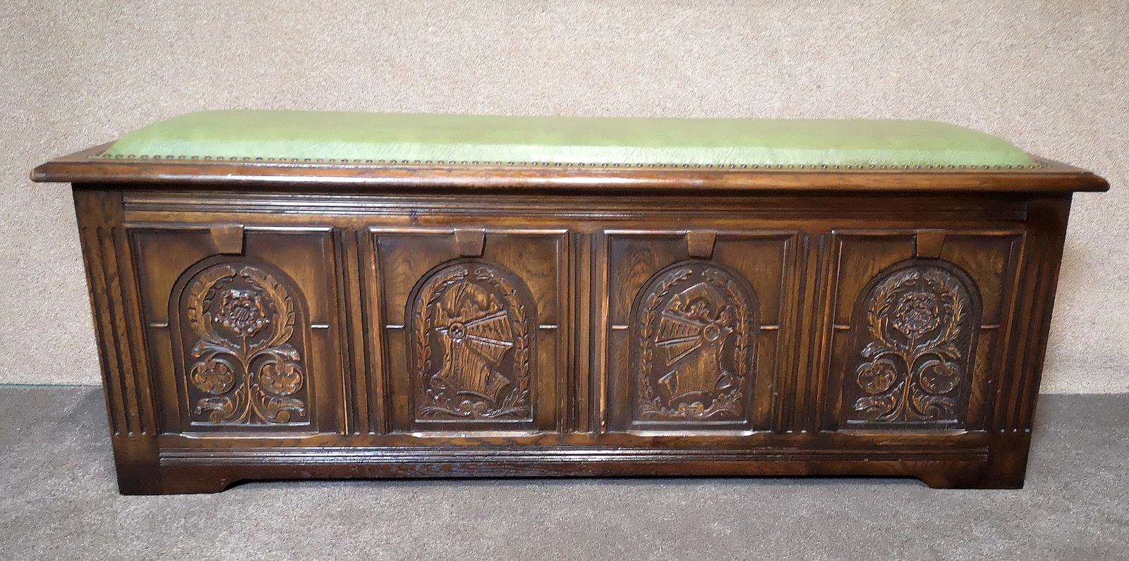 Jaycee Carved Oak Blanket Box with Leather Upholstered Seat