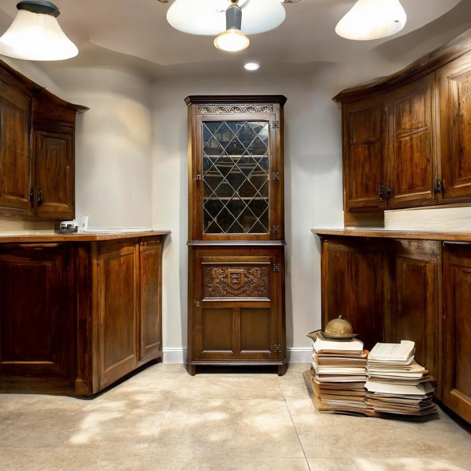Jaycee Furniture / Vintage Oak Corner Display Cabinet / Cupboard / 1970 / Dark Oak