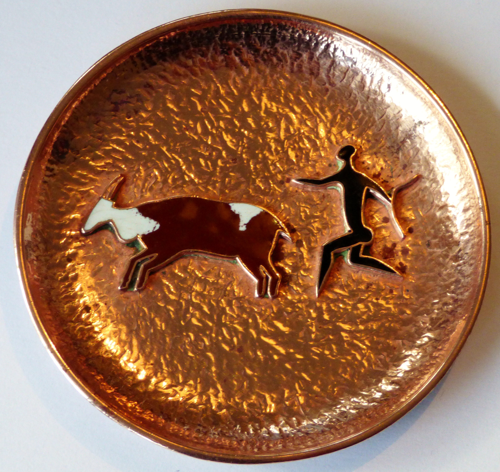 Joe Calafato (1912-1991) South African Copper & Enamel Pin Tray Feat. Hunter & Prey (C. Late 1970'S)