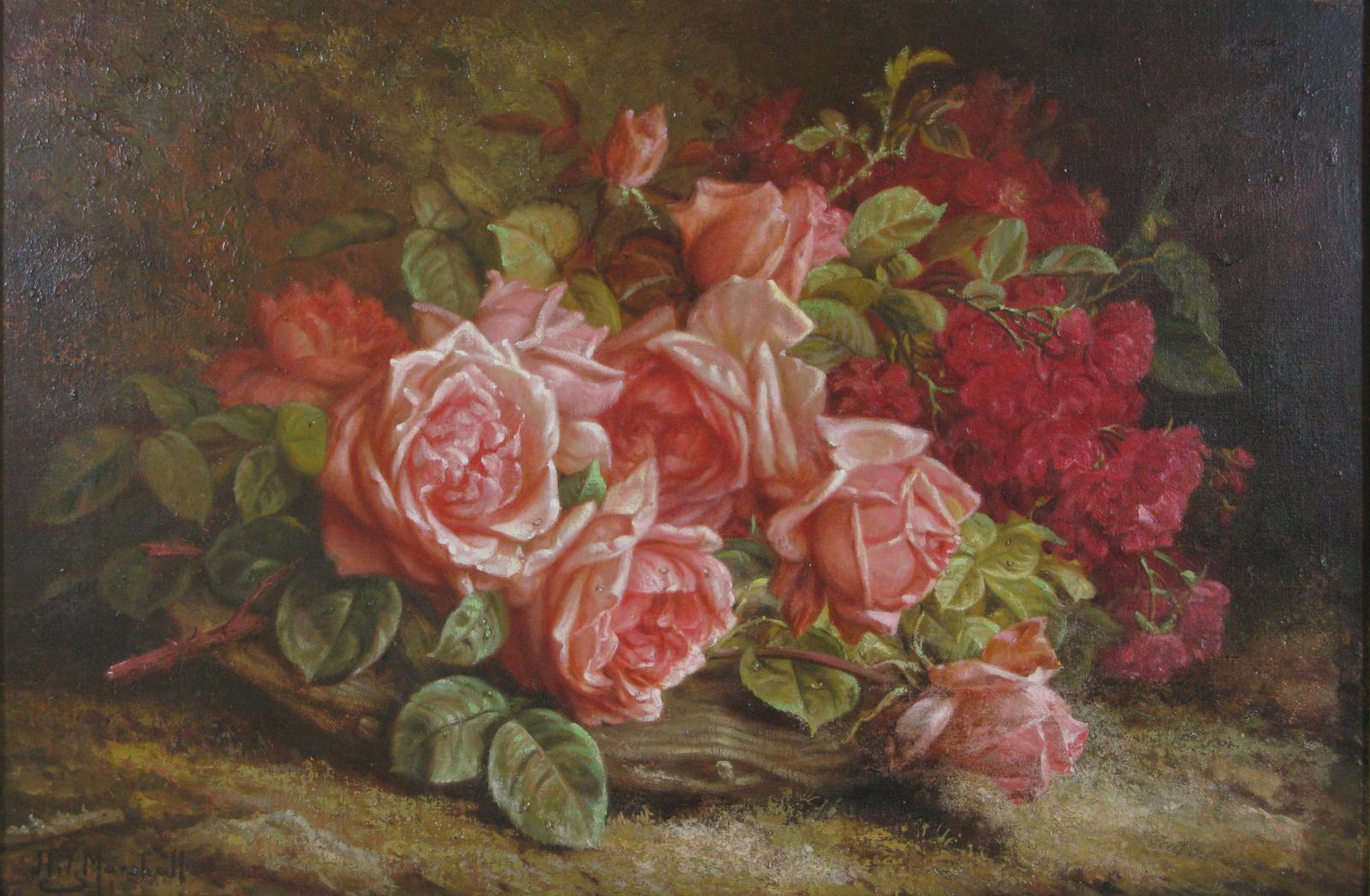 John Fitz Marshall RBA (british 1859-1932) Still Life Pink Roses Oil on Canvas