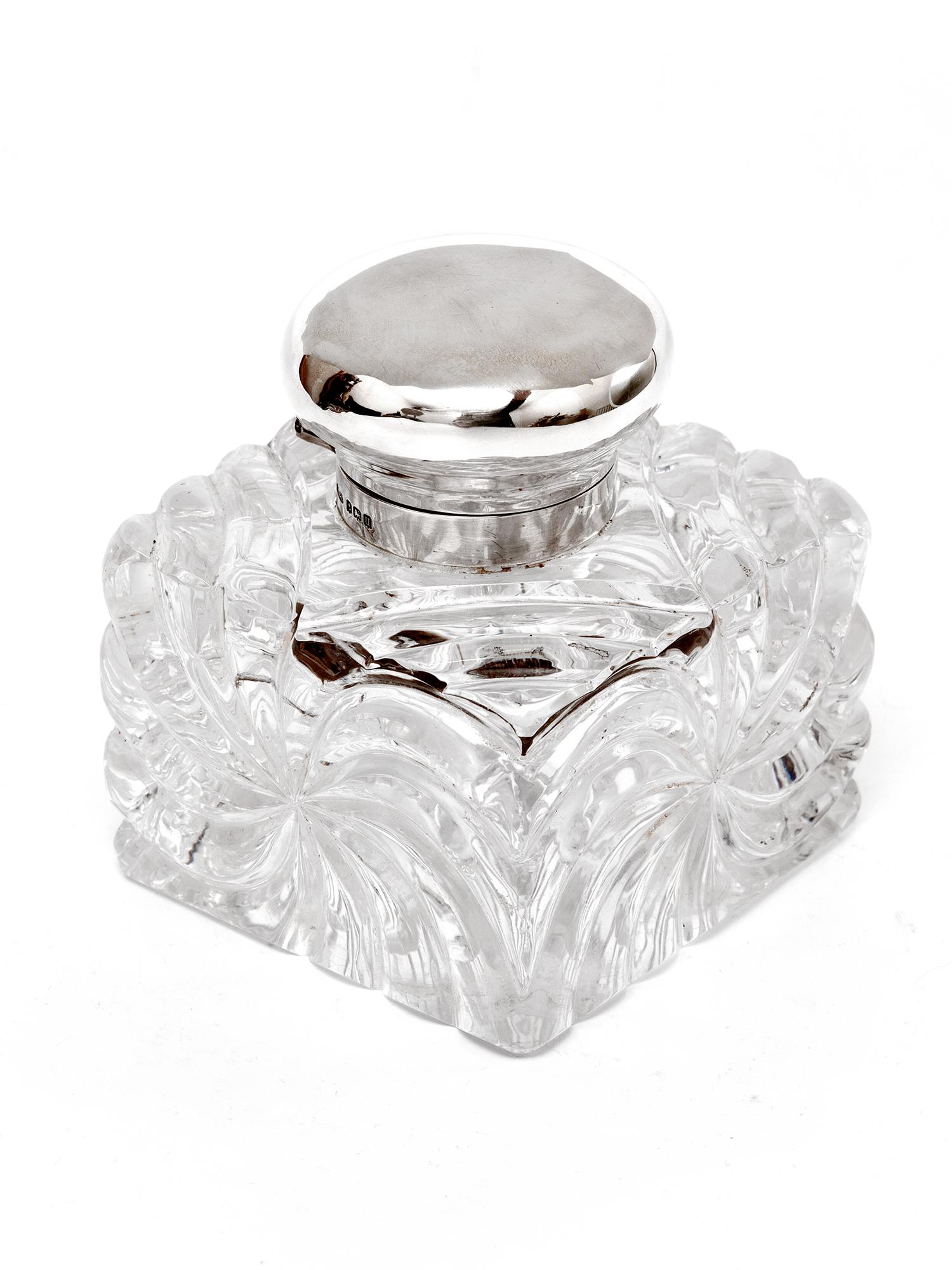 John Grinsell Silver Mounted and Cut Glass Swirl Design Inkwell