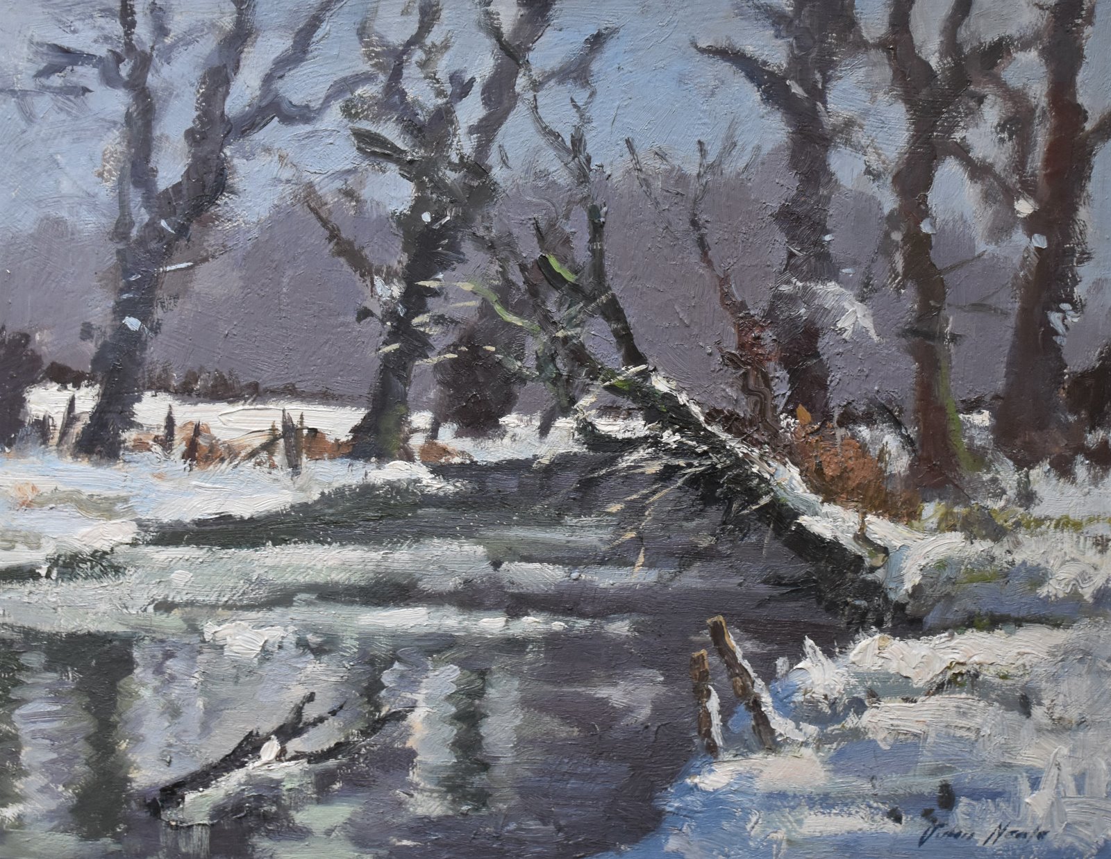 John Neale Original Oil Painting - Snowy Winter Rural Scene in Warwickshire