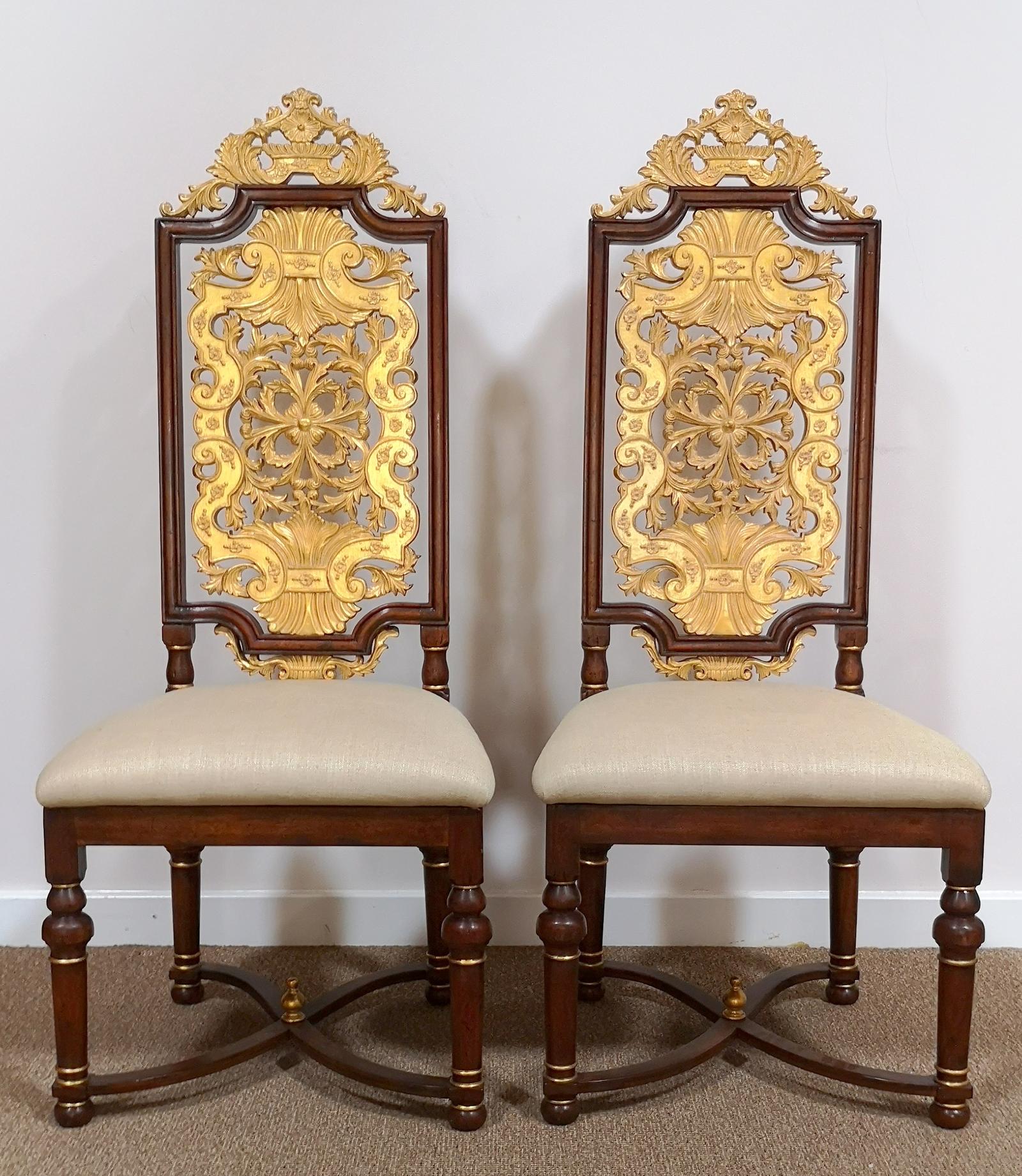 Jonathan Charles, Pair of Walnut & Parcel Gilt Hall Chairs / Dining Chairs