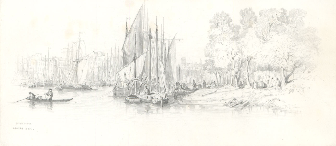 Jules Achille Noël - 1843 French Graphite Drawing, Nantes Harbour Scene