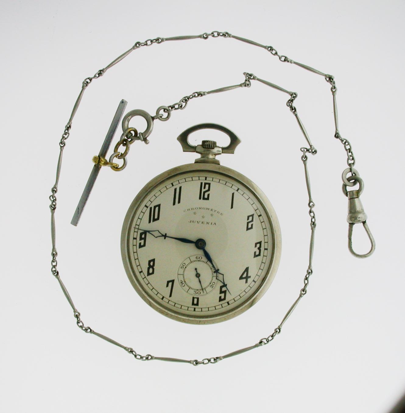 Juvenia Art Deco Nickel Plated Open Face Pocket Watch with Chain Swiss 1925
