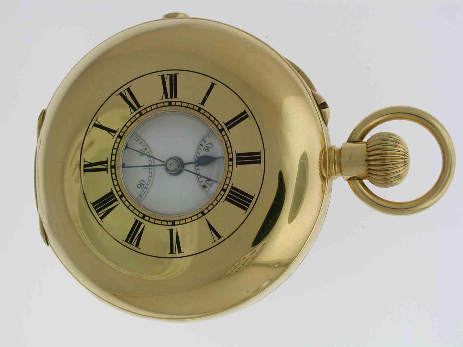 J.W. Benson 18kt Yellow Gold Half Hunter Chronograph Pocket Watch