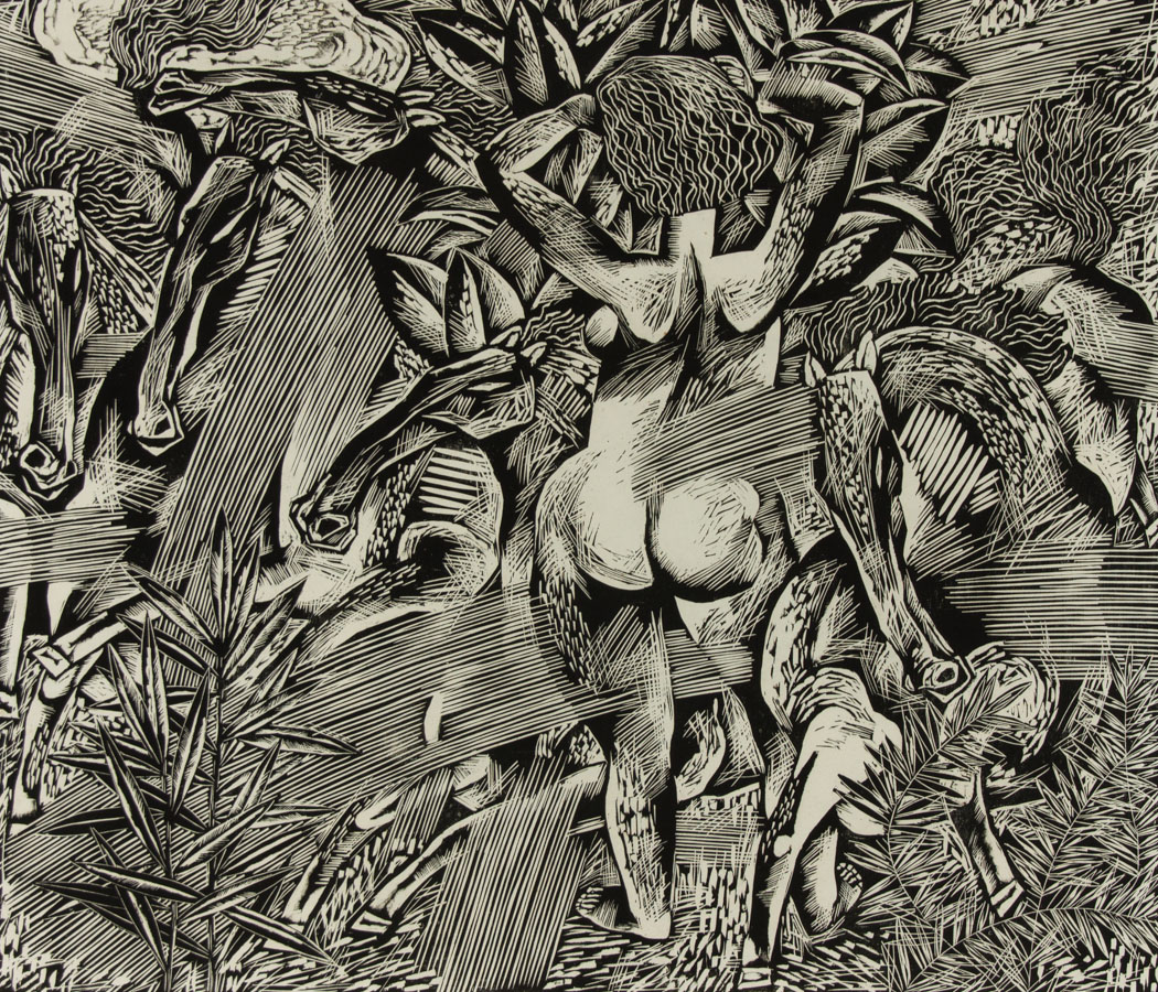 Kang Ning - Large Chinese 1998 Woodcut, Woman & Horses