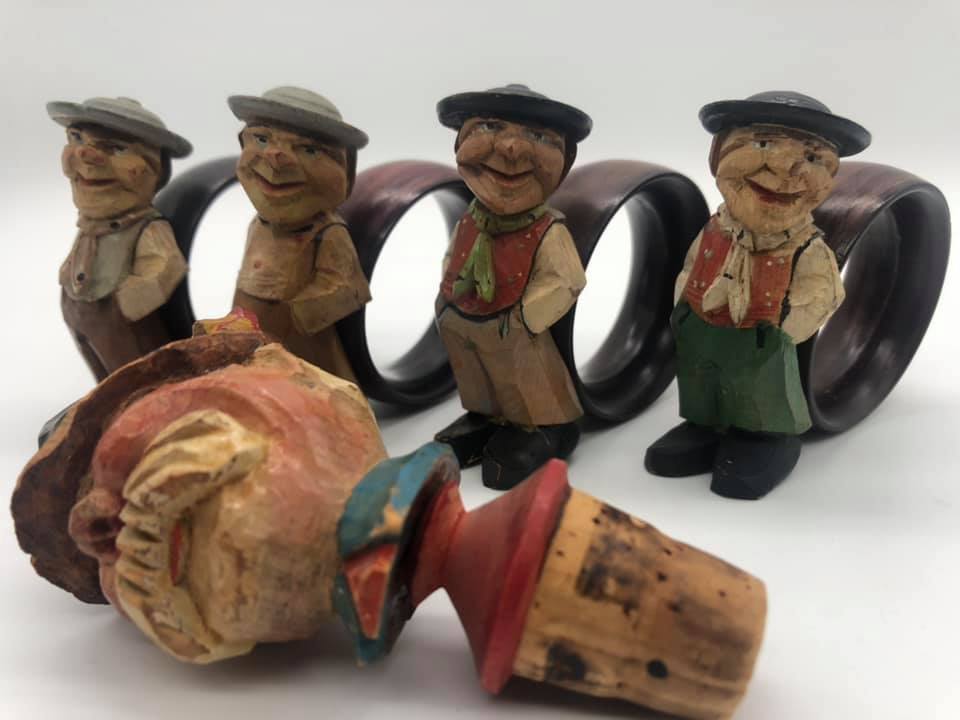 Kitsch Novely Anri Figure Napkin Rings & Bottle Stopper Set