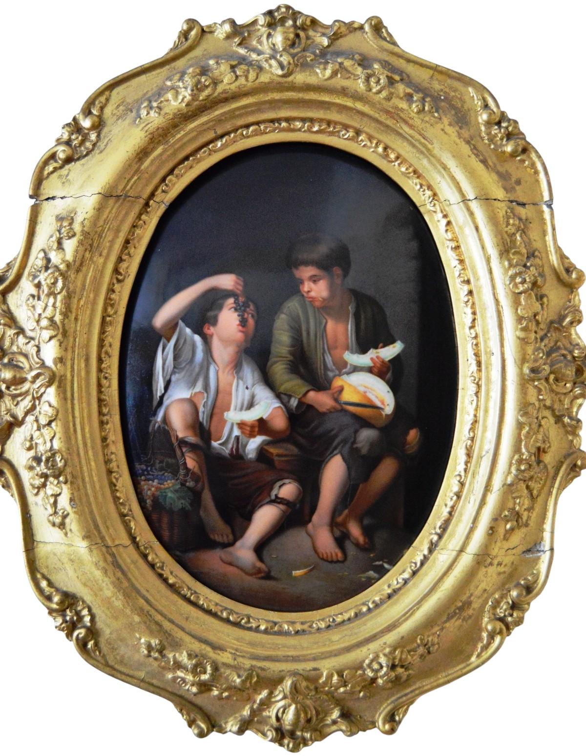 An exceptional 19th-century KPM oval porcelain plaque, finely hand-painted after Bartolomé Esteban Murillo’s The Grape and Melon Eaters.