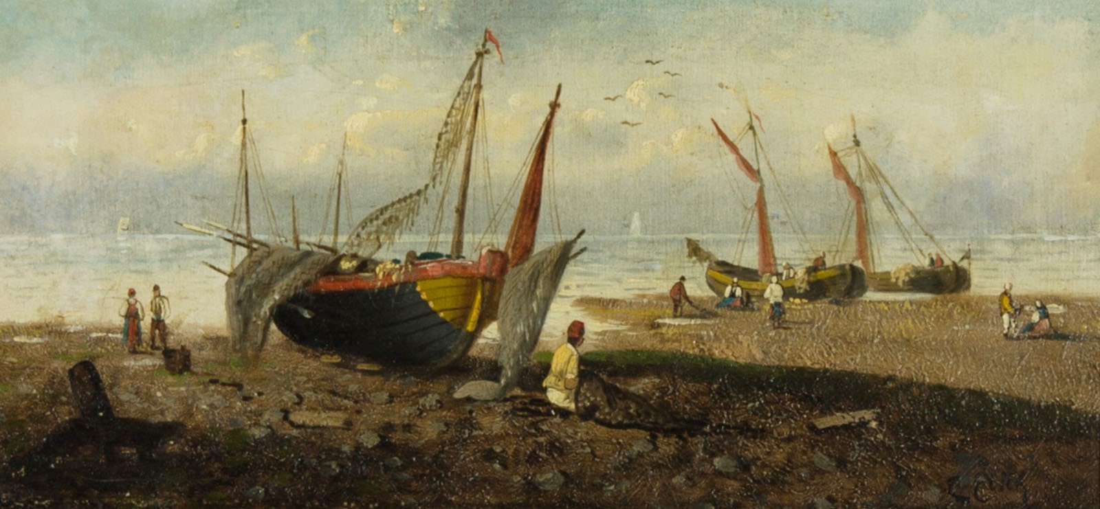 L. Erich - Impressively Framed 19th Century Oil, Ships & Figures on a Beach