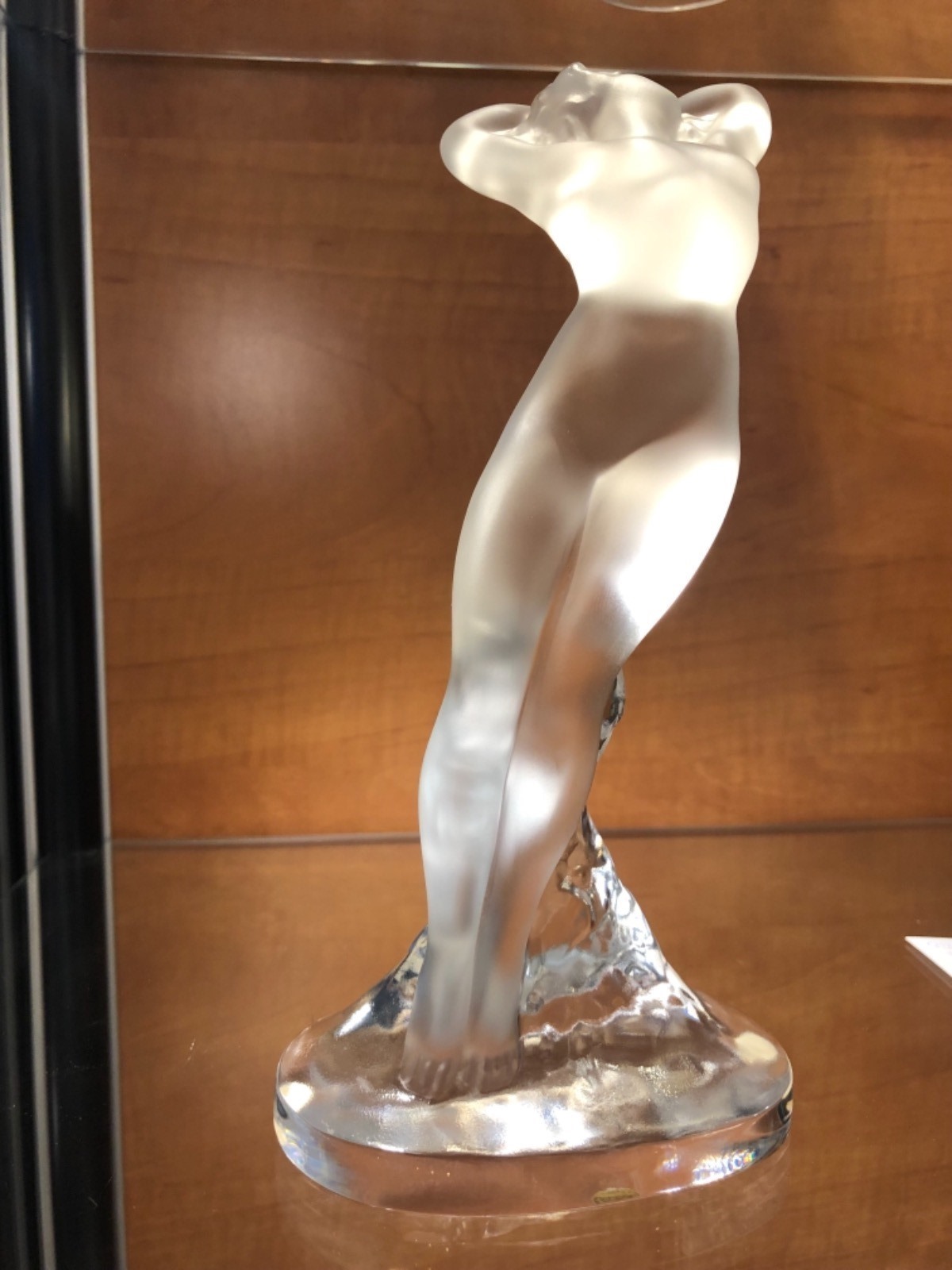 Lalique France 'Danseuse Bras Leves' Arms Up Sculpture of a Nude Dancer in Clear & Frosted Glass by Marc Lalique c.1952
