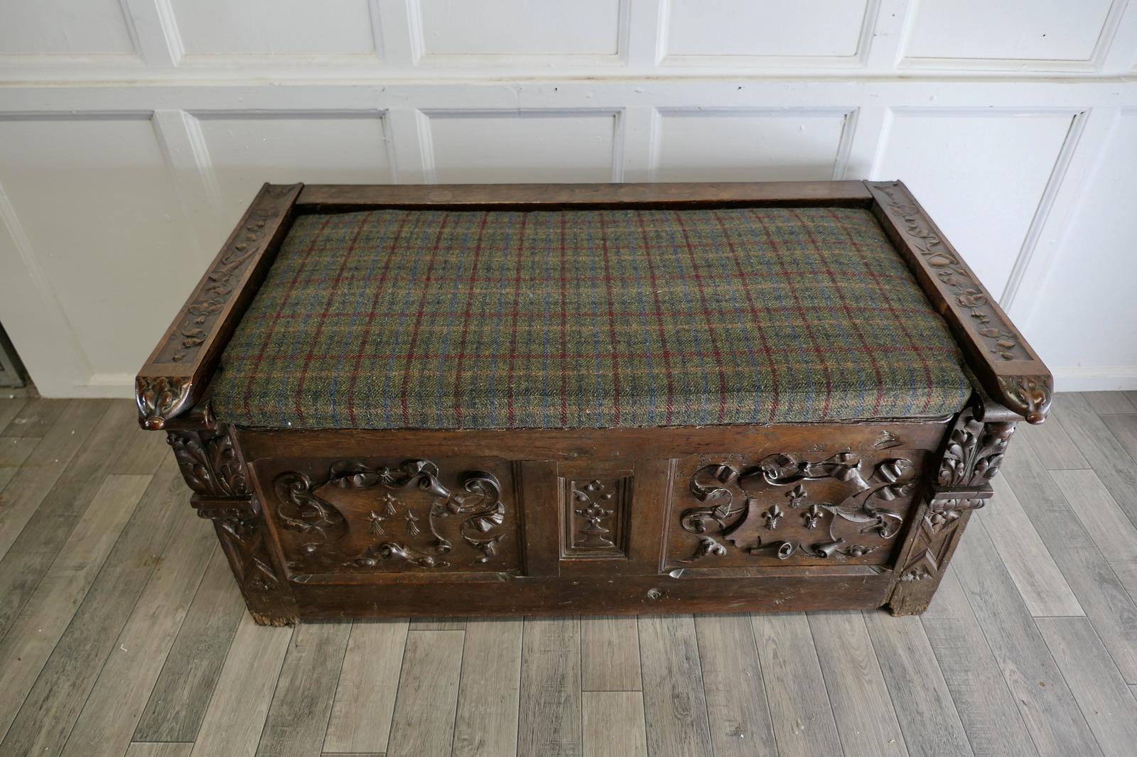 Large 18th Century Carved Oak Coffer, Hall Seat
