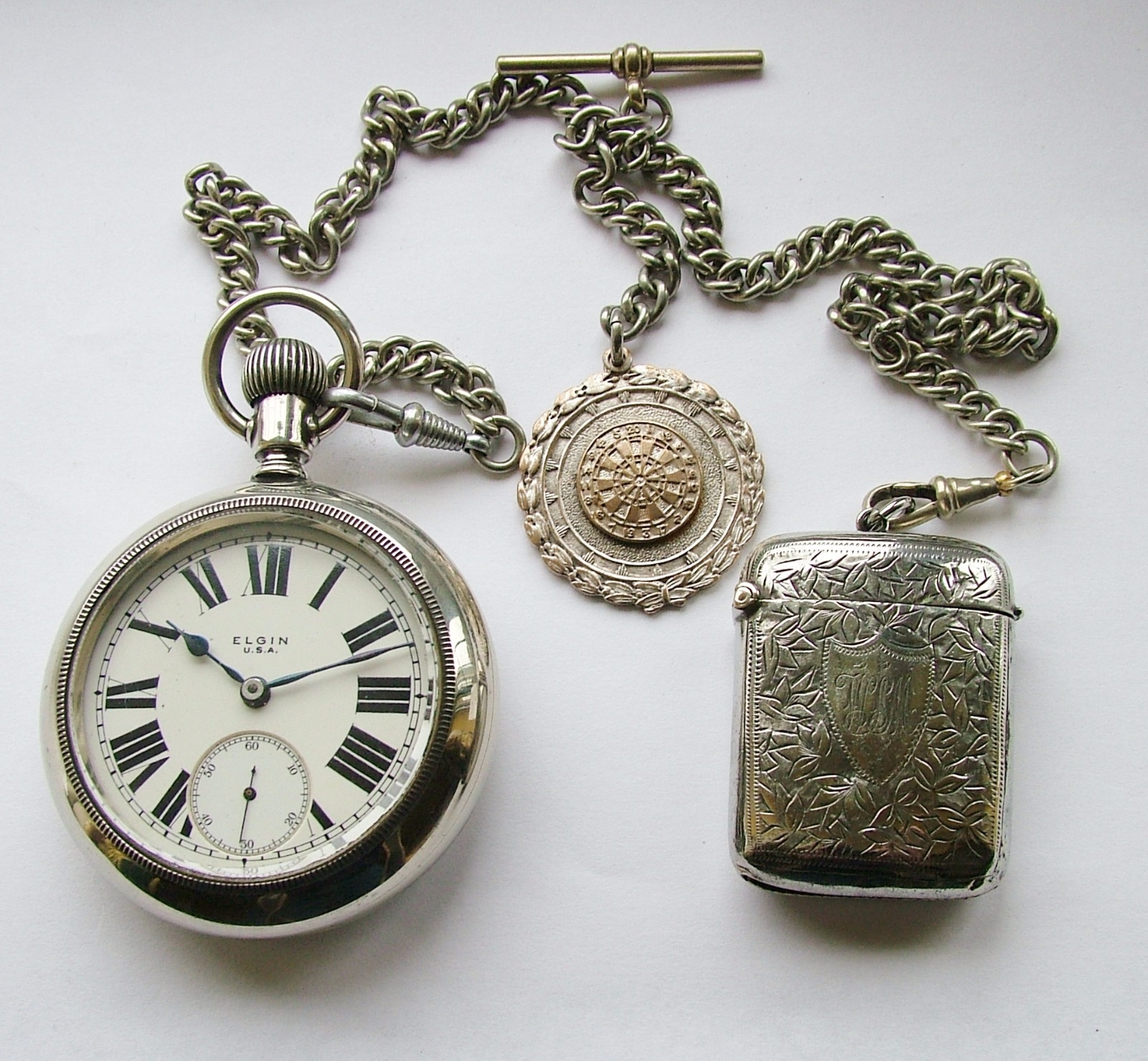Large 1920s Elgin Pocket Watch, Chain & Vesta