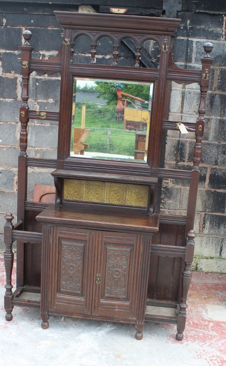 Large 1930s Carved Oak Mirrored Hallstand with Green Tiles