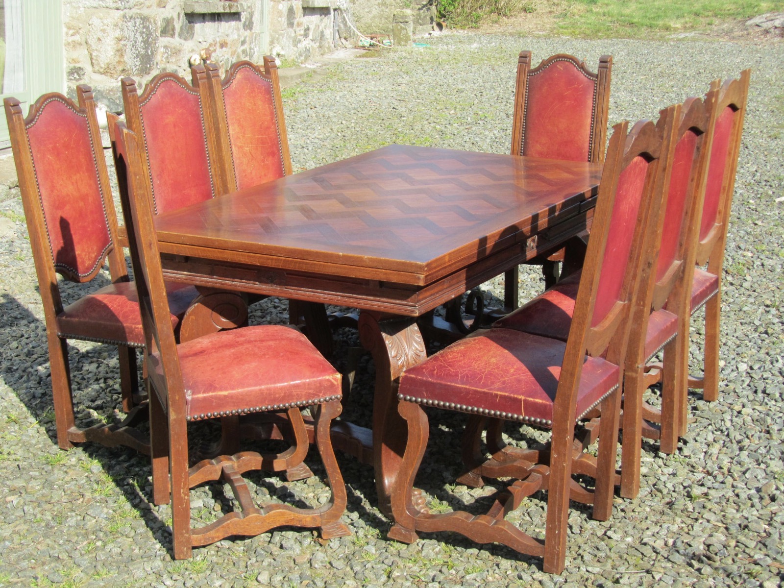 Large 19th Century Carved & Parquetry Oak Draw Leaf Table