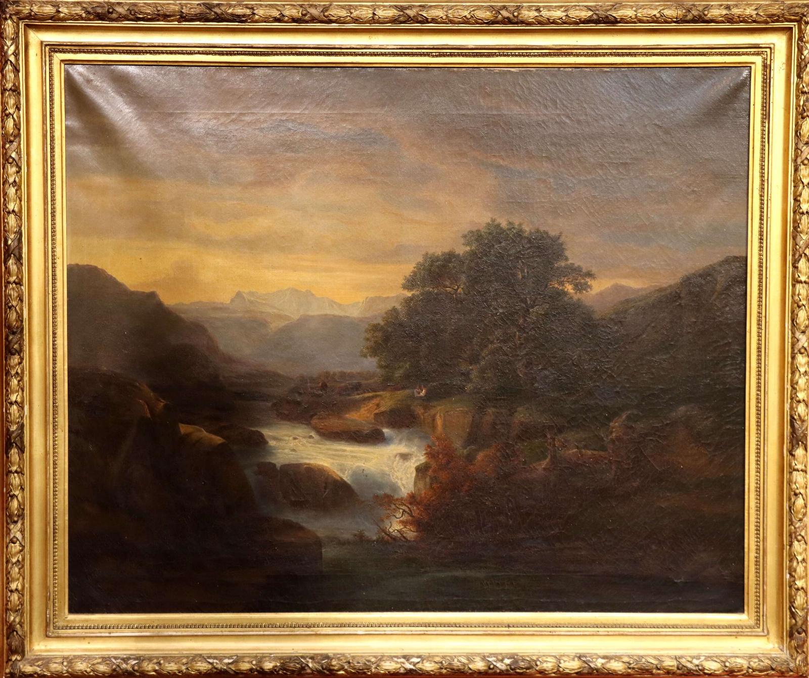 Large 19th Century Continental School Landscape Oil Painting in Original Gilt Frame