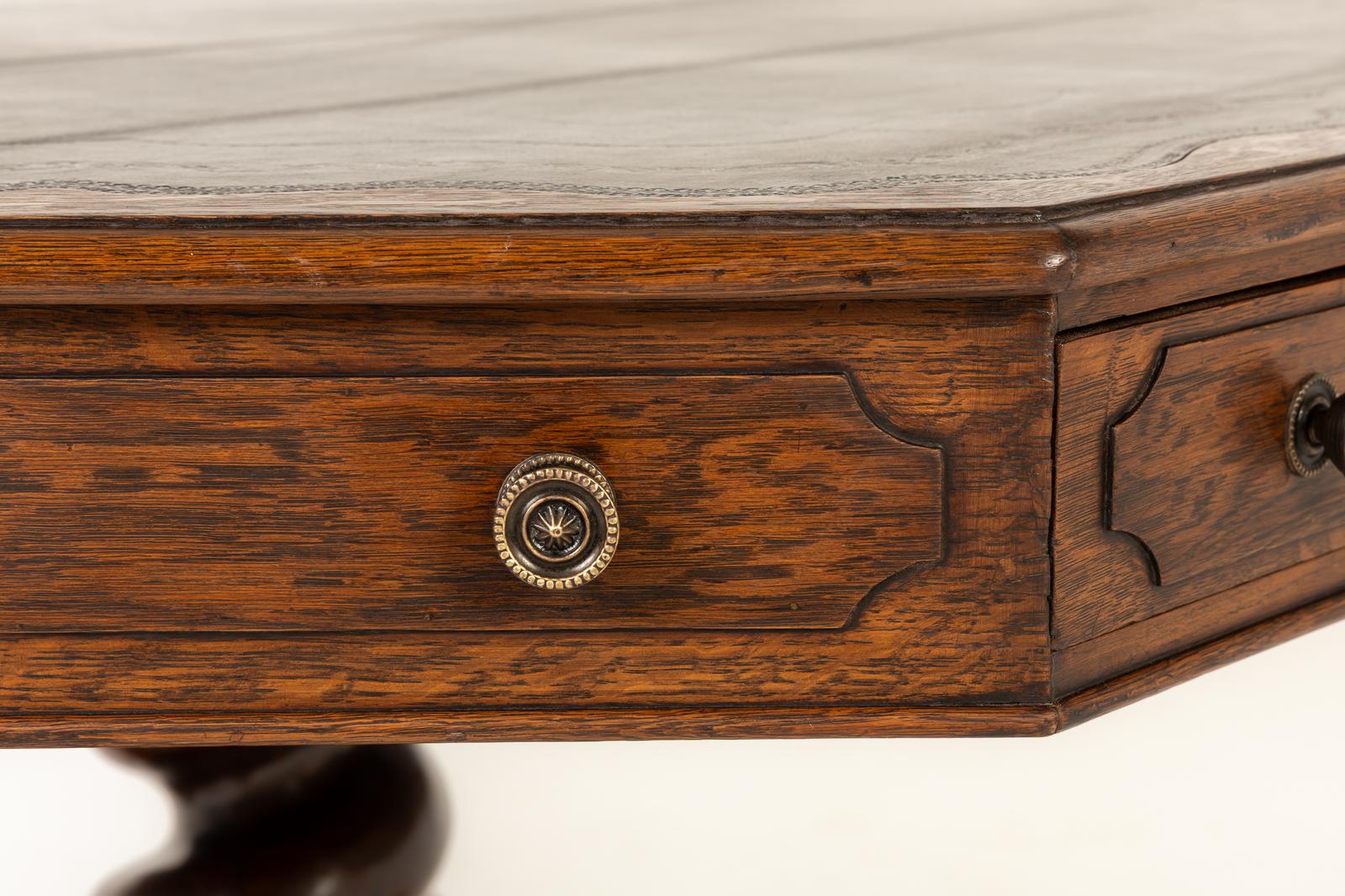 This table top has a tooled leather inset surface, with unusual wavy edges. There are four dummy drawers alternating with four functioning ones, all with panelled mouldings and small, brass pull handles. The turned supporting central column has an unusual, large barley twist shape. The quadripartite base stands on four squashed bun feet. This table was almost certainly a bespoke one-off.