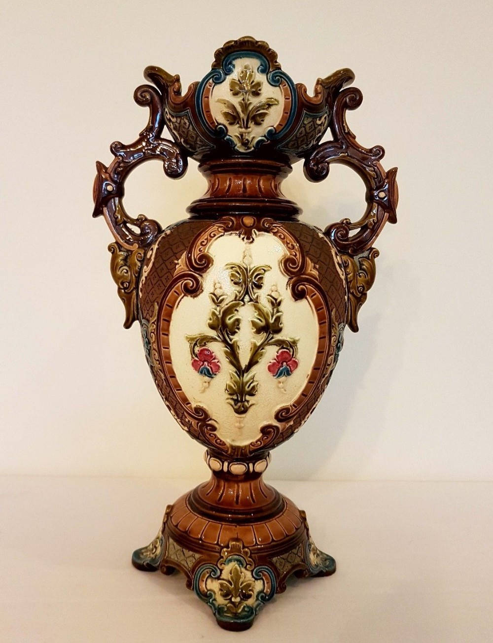 Large 19th Century Magnificent Wilhelm Schiller Majolica Dolphin Handled Vase