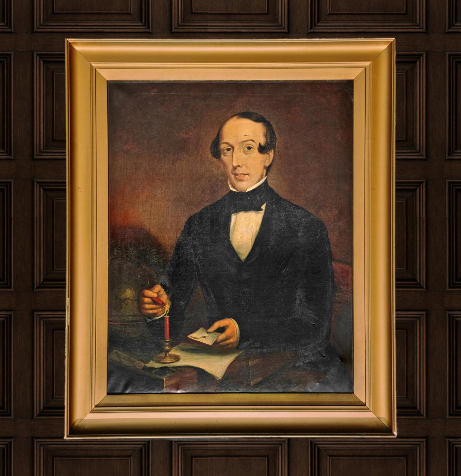 Large 19th Century Oil Portrait Painting of Man Sealing Letter 1848