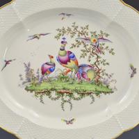 A stunning large Worcester porcelain dessert serving dish with lobed walls and shaped rim with an osier moulded border. Painted in the centre an extravagant scene centred on four Sevres style "fancy birds" coloured in puce, sky blue, orange and lemon yellow / lime green enamels. One is perched in a tree and the other three stand in a very finely painted stylised green land with a city landscape in the distance of buildings and a cathedral, greyed out trees and flocks of birds up in the sky. The lower edge of this fantasy scene is decorated with hanging flowering garlands and the lower walls are dotted with butterflies and more fancy birds in flight. Finished with a gilt dentil rim. Unmarked, c.1770-1775.