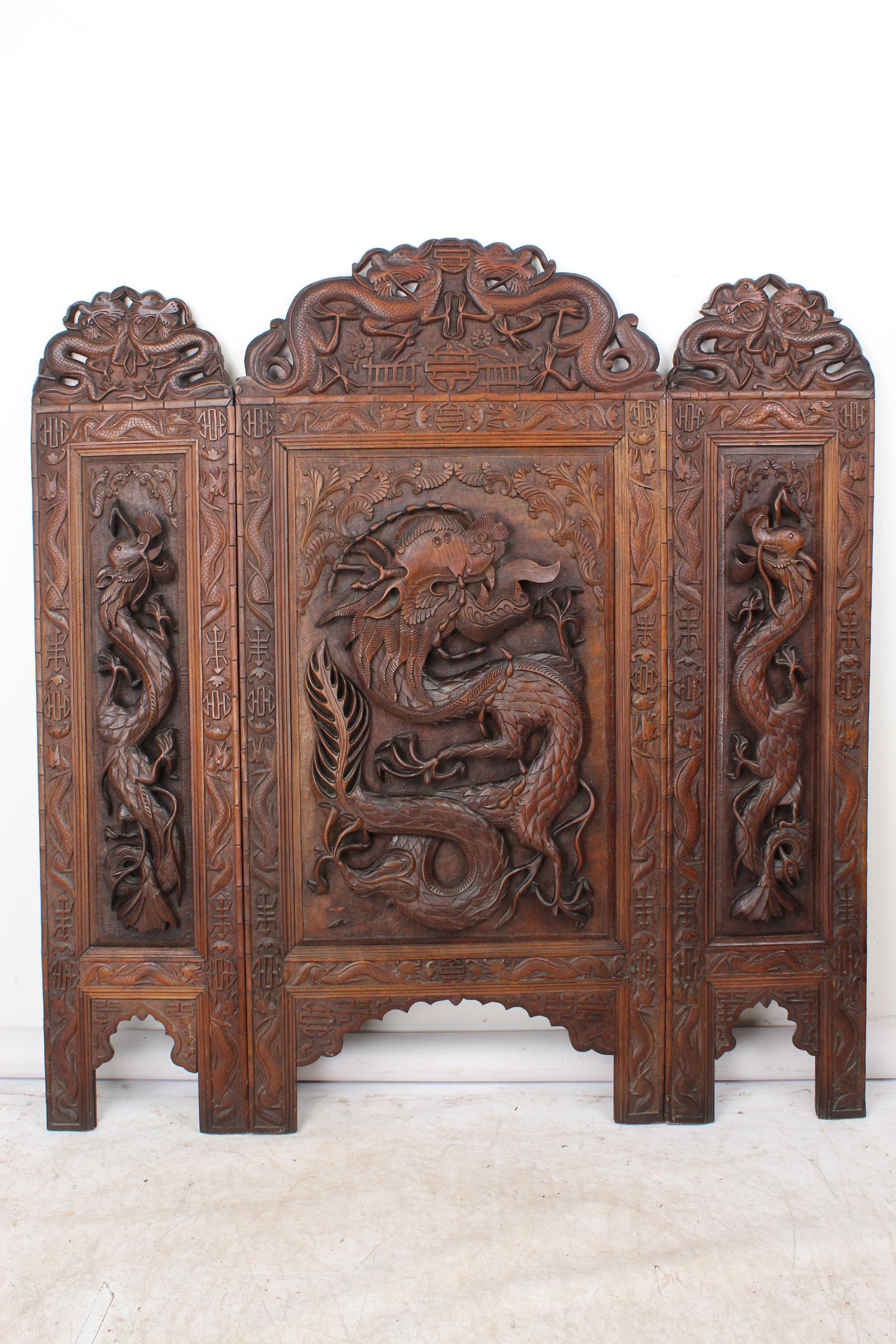 Large Antique Anglo Indian Kashmiri Dragon Carved Walnut Fire Screen