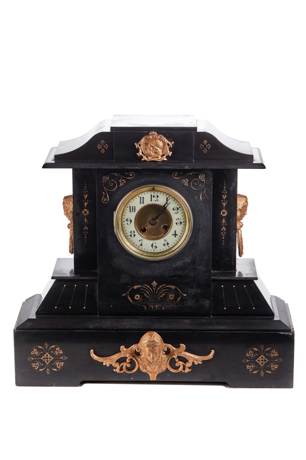 Large Antique Black Slate Mantel Clock with Gilt Detail