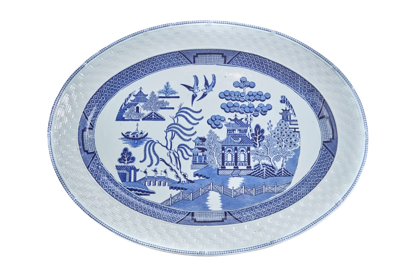 Large Antique Chinese Blue & White Willow Pattern Meat Platter