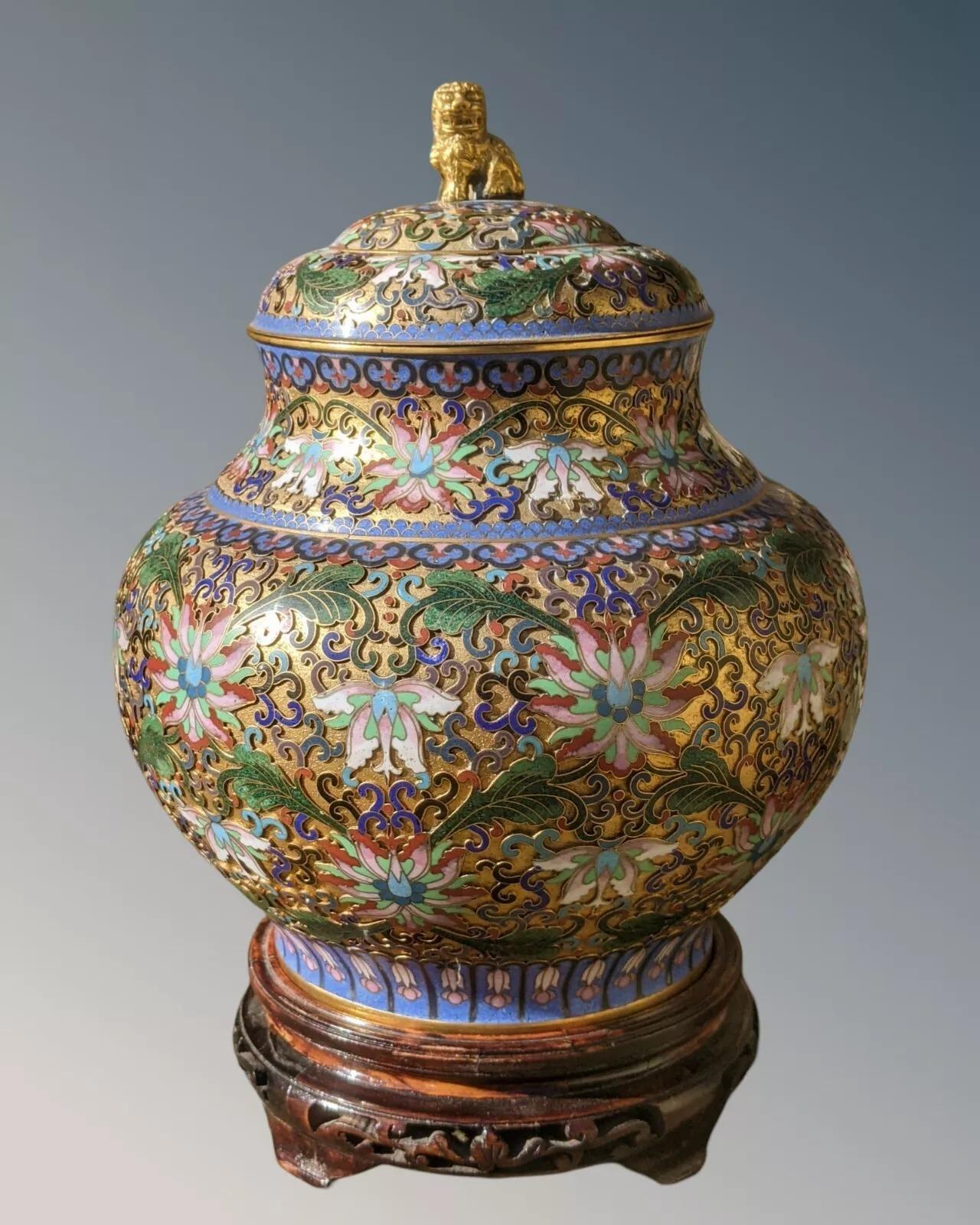 Large Antique Chinese Champlevé Cloisonné Lidded Vase on Stand