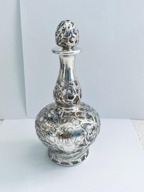 Large Antique Clear Glass Perfume Scent Bottle with Sterling Silver Overlay 1885
