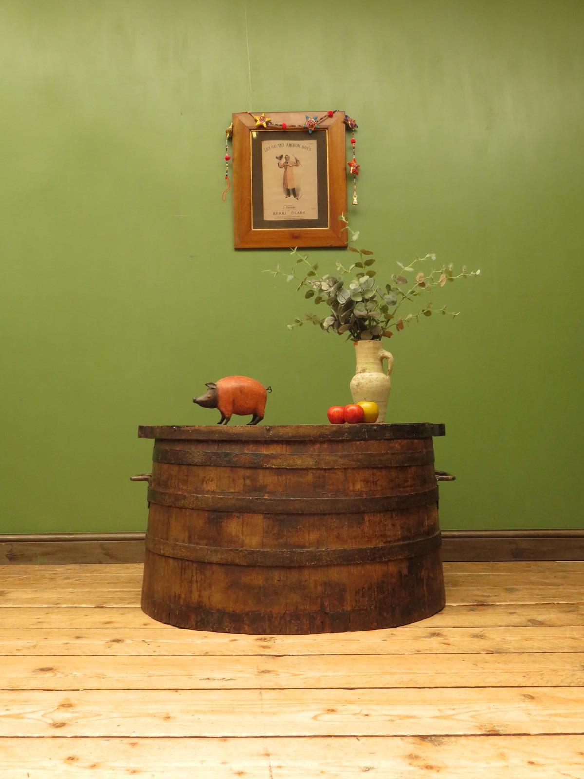 Large Antique Coopered Pig Salting Barrel with Lid, Rustic Coffee or Bar Table