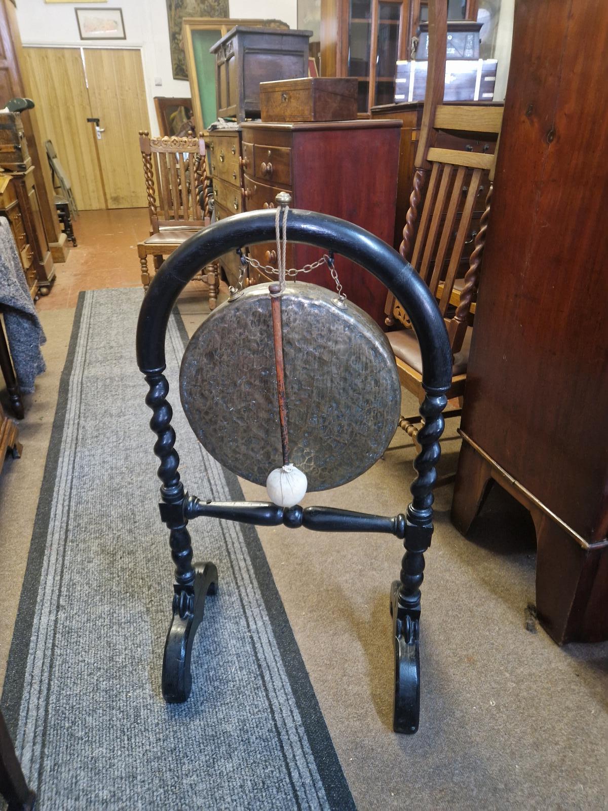 An impressive large 1900s brass dinner gong supported by ebonised oak stand complete with striker.