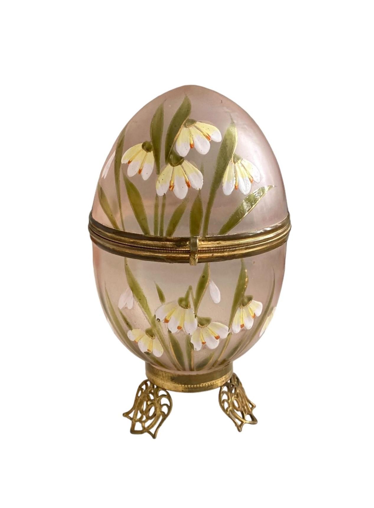Large Antique Egg Form Trinket Box Hand Painted Satin Glass c.1900