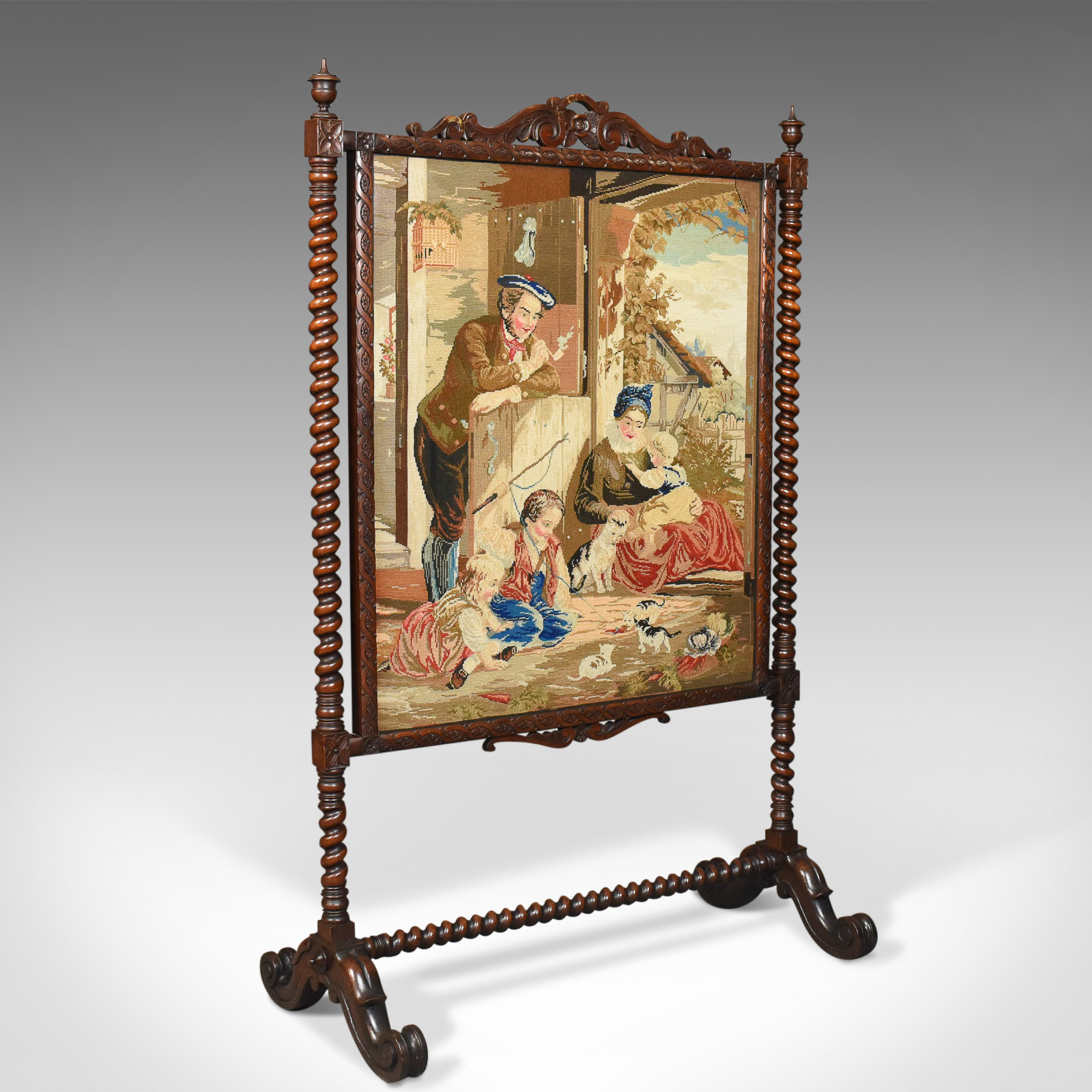Large Antique Fire Screen, Needlepoint Tapestry Panel, Walnut Frame c.1850