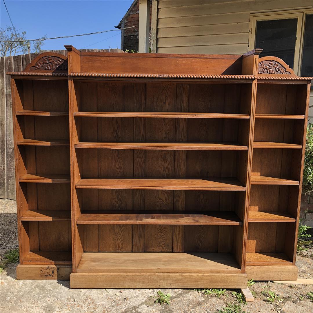 Large Antique Oak Adjustable Book Shelves with Carved Panels 1920s