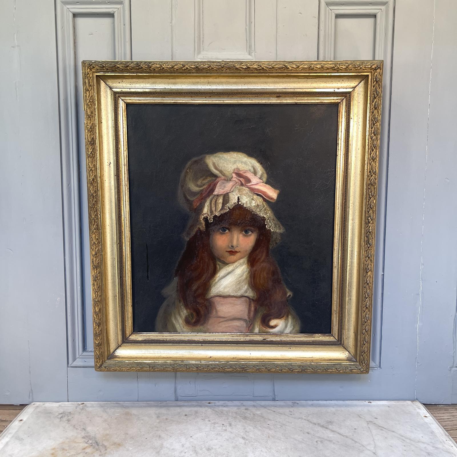 Large Antique Oil Painting Portrait of Young Girl in Lace Bonnet