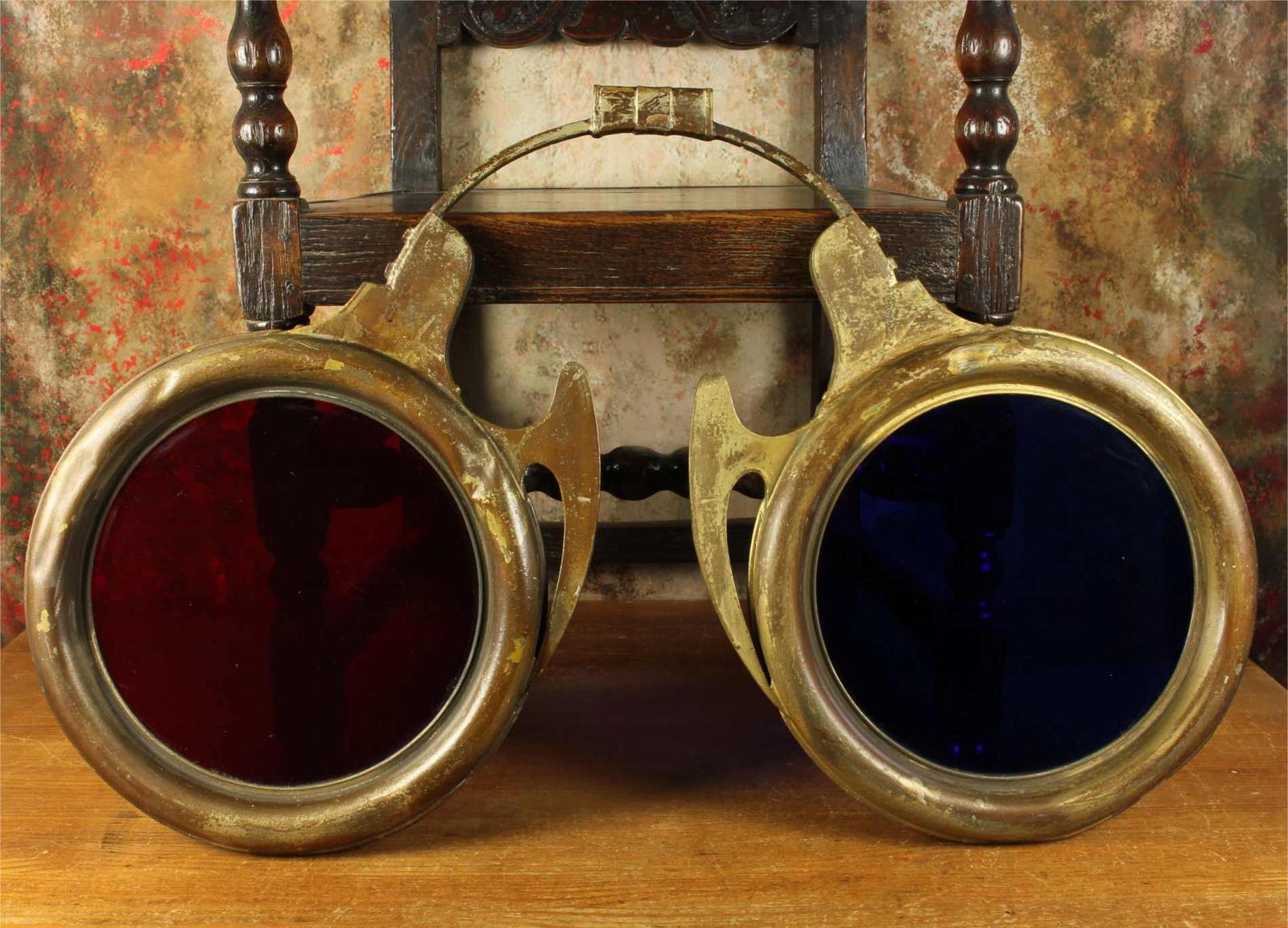 This highly decorative antique piece which is a large size originated in France and would have been hung outside an optician's / optometrists. This sign is fitted with it's original handmade red and blue coloured glass lenses which have beautiful variations, flecks and bubbles.